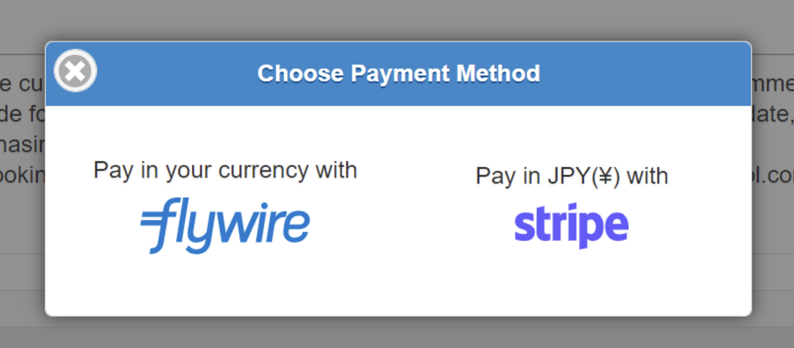 - 予約の開始日が4日以内の場合Stripeに誘導されFlywireはオプションとして表示されません。