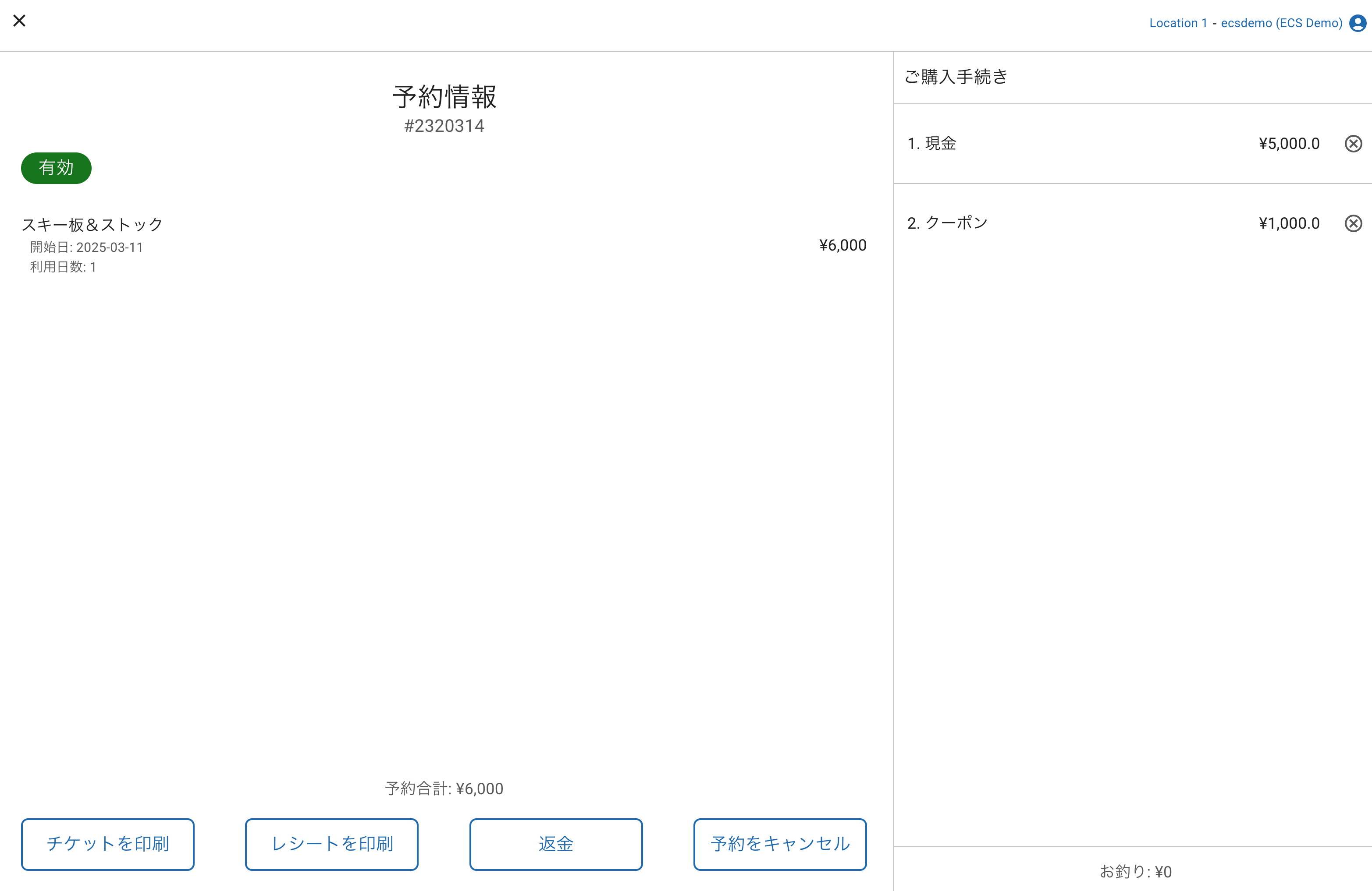 予約情報を確認、またチケットやレシートの印刷、返金、予約のキャンセルもこのページから行うことができます。