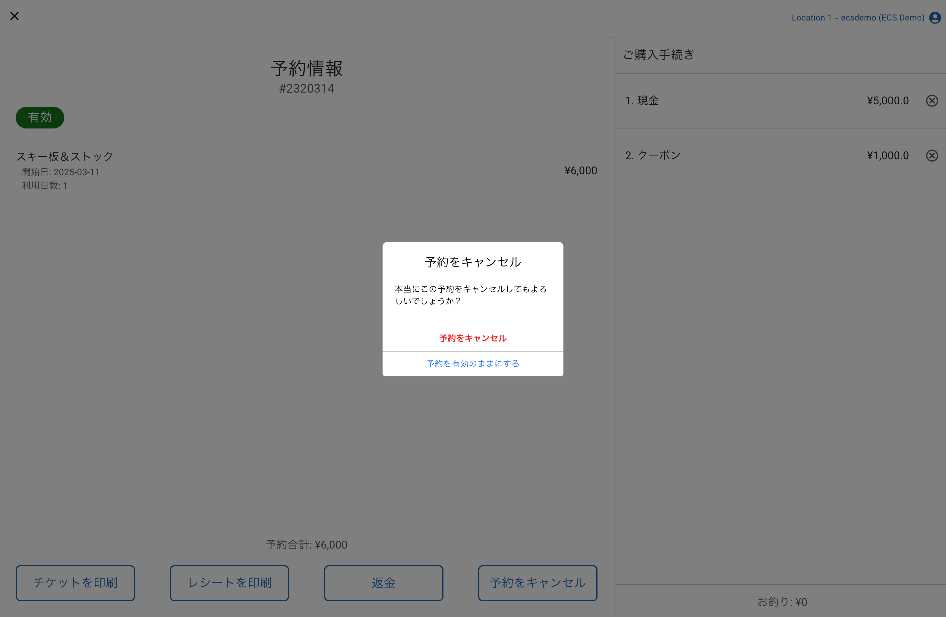 予約をキャンセルボタンをクリックし、キャンセルを確定します。 - キャンセルが完了すると、ステータスが「有効」から「キャンセル」に変更されます。
