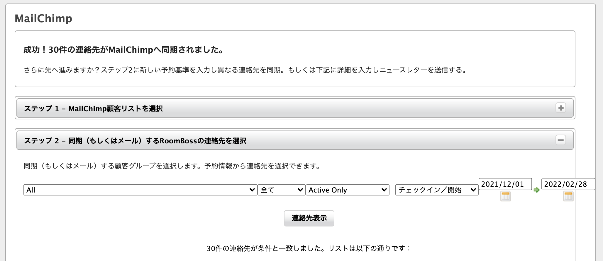 注意: 同期しようとしている顧客情報が既にMailchimpに存在する場合、既存のMailchimp顧客情報は、ここでRoomBossからMailchimpへ同期する新しい顧客情報へと上書きされます。