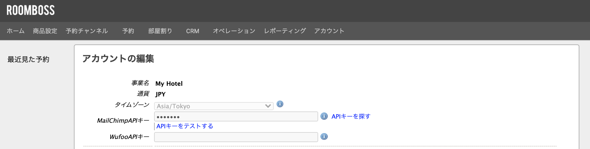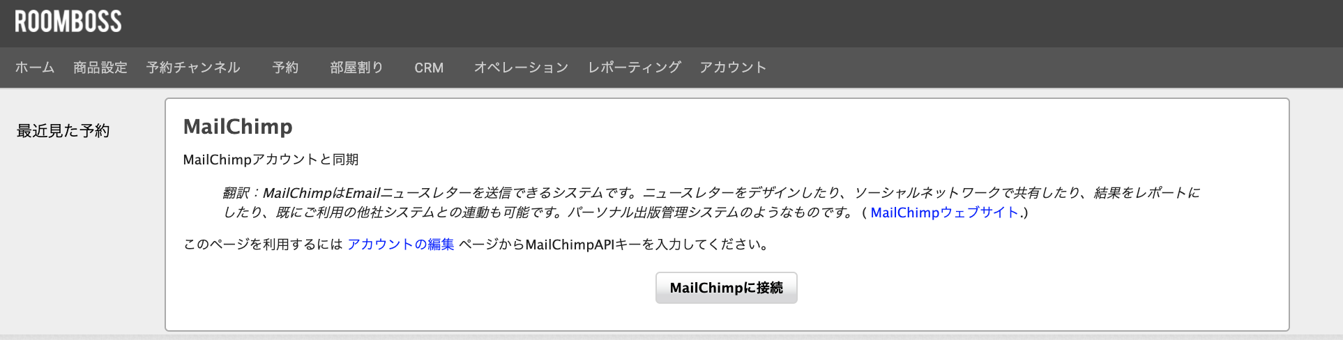まず初めにRoomBossとMailchimpとリンクするために、MailchimpアカウントのAPIキーをRoomBossアカウントに入力する必要があります。これでMailchimpとの同期が可能になります。