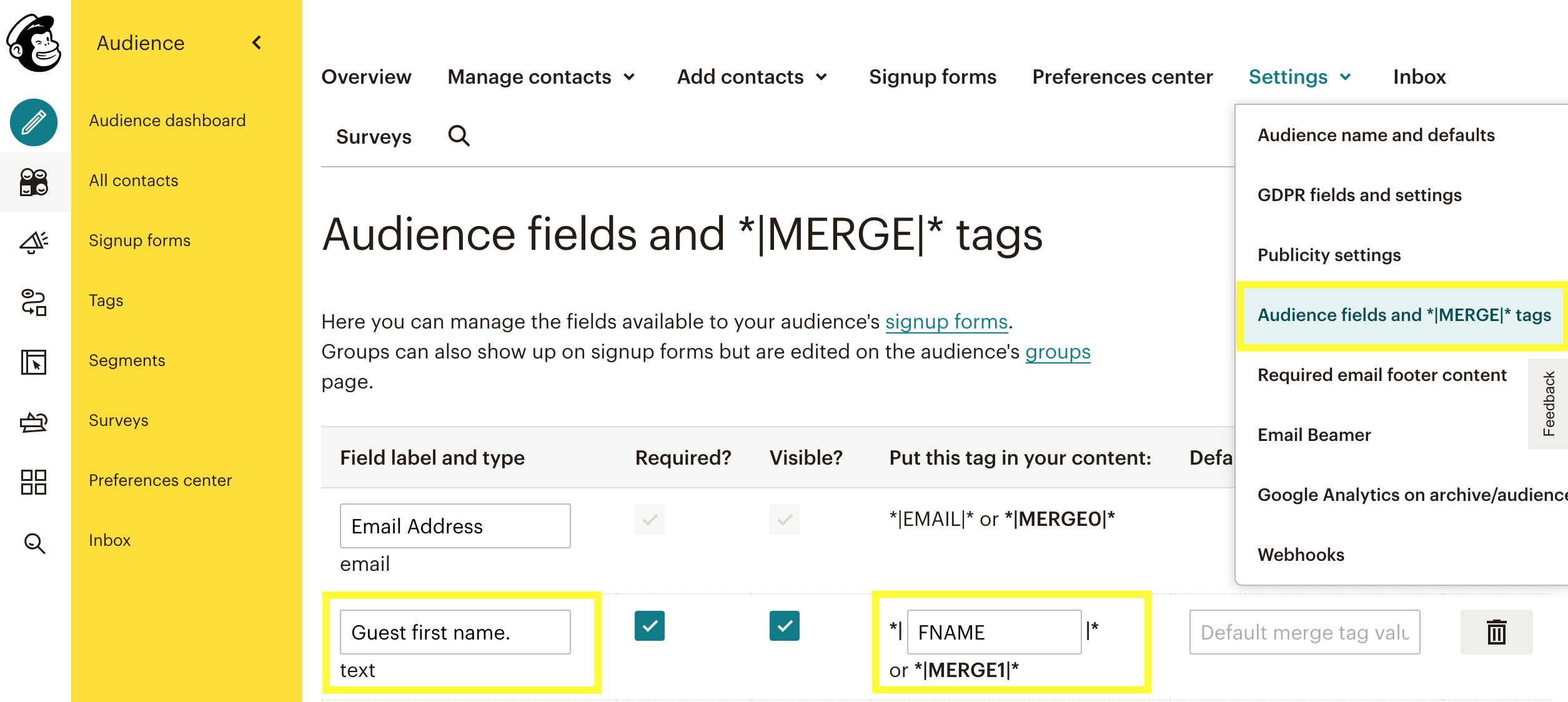 - メニュー →Audience→ Settings → Audience fields and *|MERGE|* tagsへ移動。