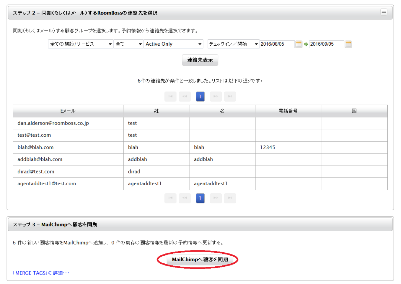 注意: 同期しようとしている顧客情報が既にMailchimpに存在する場合、既存のMailchimp顧客情報は、ここでRoomBossからMailchimpへ同期する新しい顧客情報へと上書きされます。