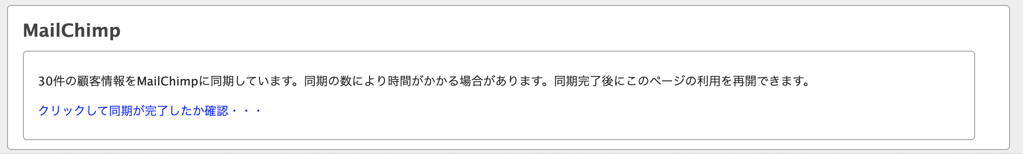 Mailchimpへ顧客を同期をクリックした後、同期完了までに少し時間がかかる場合があります。その場合は、クリックして同期が完了したか確認・・・をクリックして進行状況を確認できます。完了していない場合はもうしばらくお待ちください。