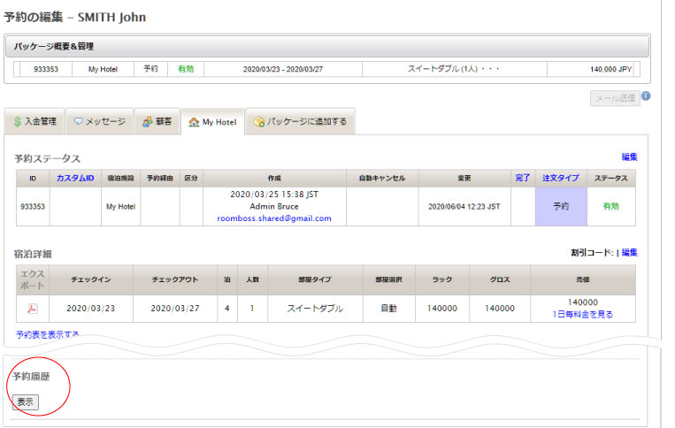 予約履歴は予約の編集画面の各予約アイテムタブの最下部で閲覧でき、下記を含みます: