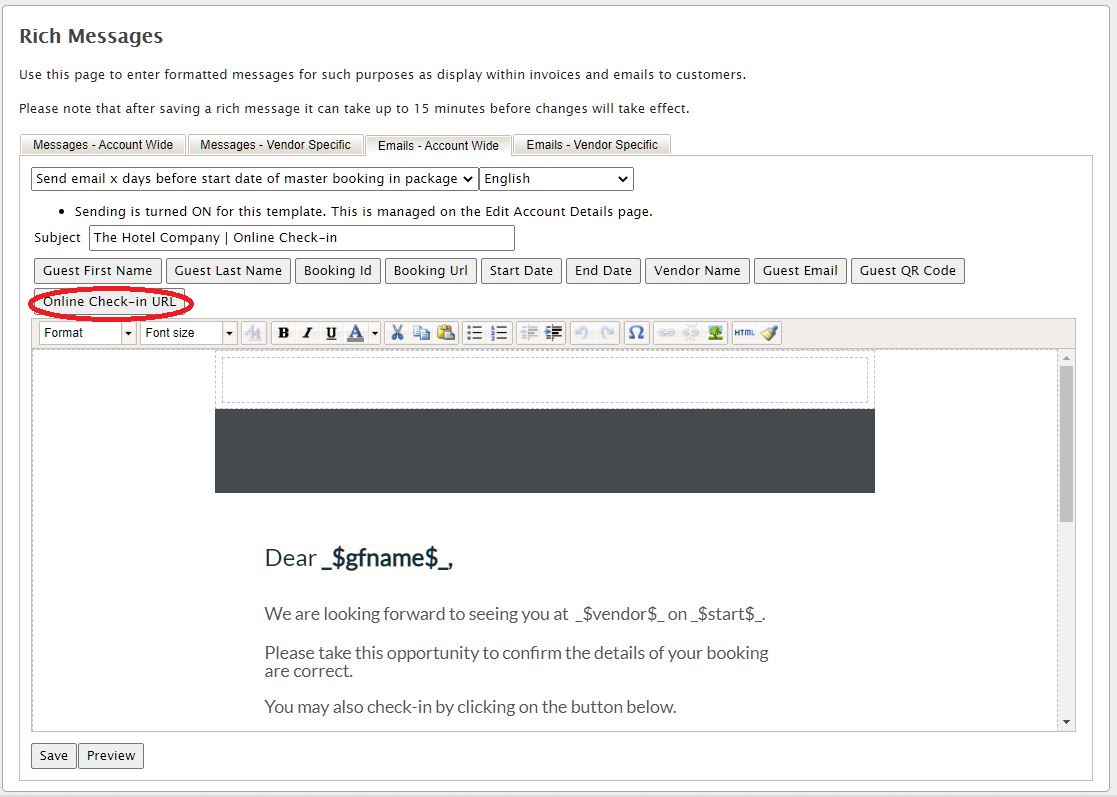 Steps on how to set up the pre-arrival email templates with the Check-in Form URL.