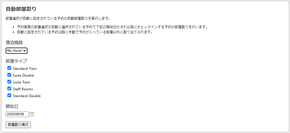 - チェックボックスをクリックして自動部屋割りする部屋タイプと割当てを適用させる開始日を選択することもできます。 (選択した日以降にチェックインする予約が自動部屋割りされます。)
