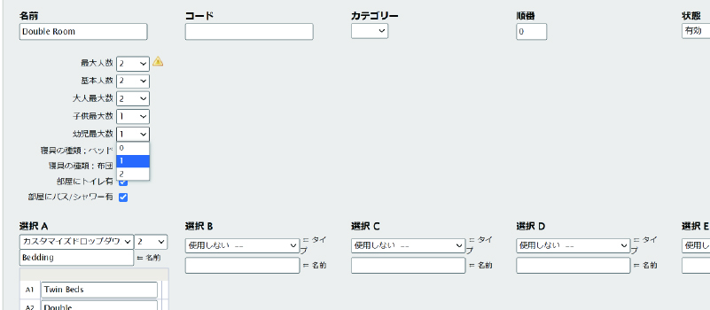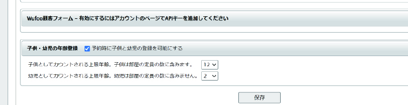 フロント・予約・ハウスキーピングの運用予約予約に含まれる大人、子供、幼児の人数を記録するこのページの見出し予約に含まれる大人、子供、幼児の人数を記録する 設定方法 各ベンダーごとに以下の手順で設定してください: 商品詳細 のページを開きます。 ベンダーを選択。 ポリシーのタブを開きます。 予約時に子供と幼児の登録を可能にするを有効にします。 子供、幼児それぞれの年齢上限を入力します。 保存ボタンを押します。 その後、商品詳細 のページの部屋タイプのタブから、以下の画像のように各部屋タイプの大人、子供、幼児それぞれの定員を設定してください。