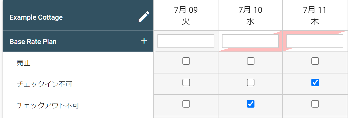 このポリシーが適用された料金プランのチェックイン不可とチェックアウト不可が次のように設定されます: