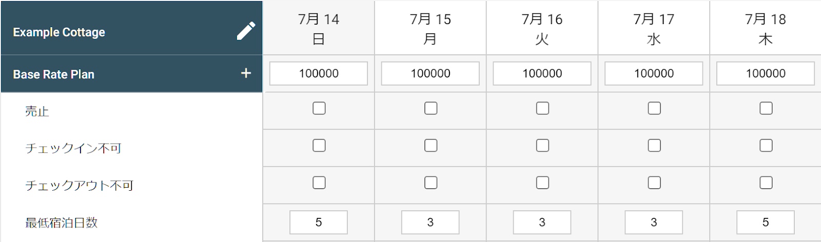 - この設定がされた場合、チェックイン不可とチェックアウト不可の設定を使用して、予約の前後にこの泊数のギャップの生成を強制します。
