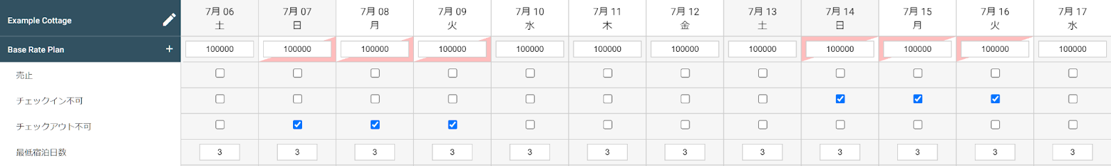 「チェックアウト不可」を10日に設定すると、10日にチェックアウトする予約の作成を防ぐことができ、強制的にこの予約の前に1泊のギャップを作成します。
