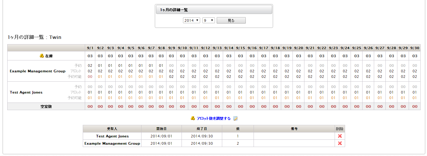 9月の詳細一覧をみてみましょう。Example Management Groupには直接予約用に2部屋が、Test Agent Jonesには1部屋がアロットとして与えられています。2日から8日までExample Management Groupの直接予約が1件入っていますので、アロットとしてある2部屋のうちの1部屋がこの予約で使用されています。