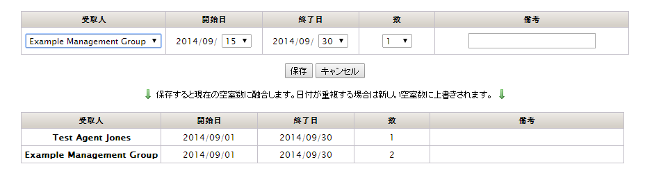 例えば上記のスクリーンショットの設定を行うとします。保存するをクリックすると、9月15日から9月30日までのExample Management Groupのアロット数は1部屋となりますが、すでに設定されている9月1日から14日までは2部屋のままで変更はされません。