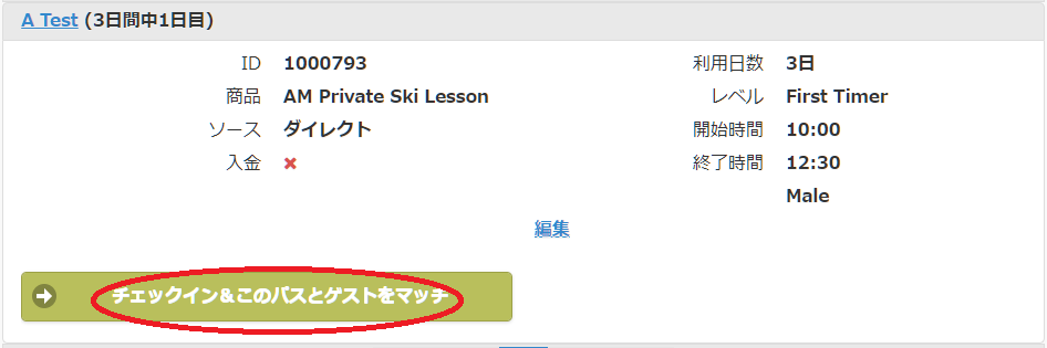 6. チェックイン&このパスとゲストをマッチをクリックして、お客様のチェックインを行い、RFIDタグ(リフト券)に関連付けます。