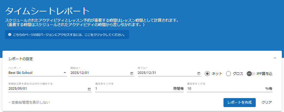 このレポートには指定した期間におけるインストラクターの給料、レッスンやアクティビティの詳細が表示されます。