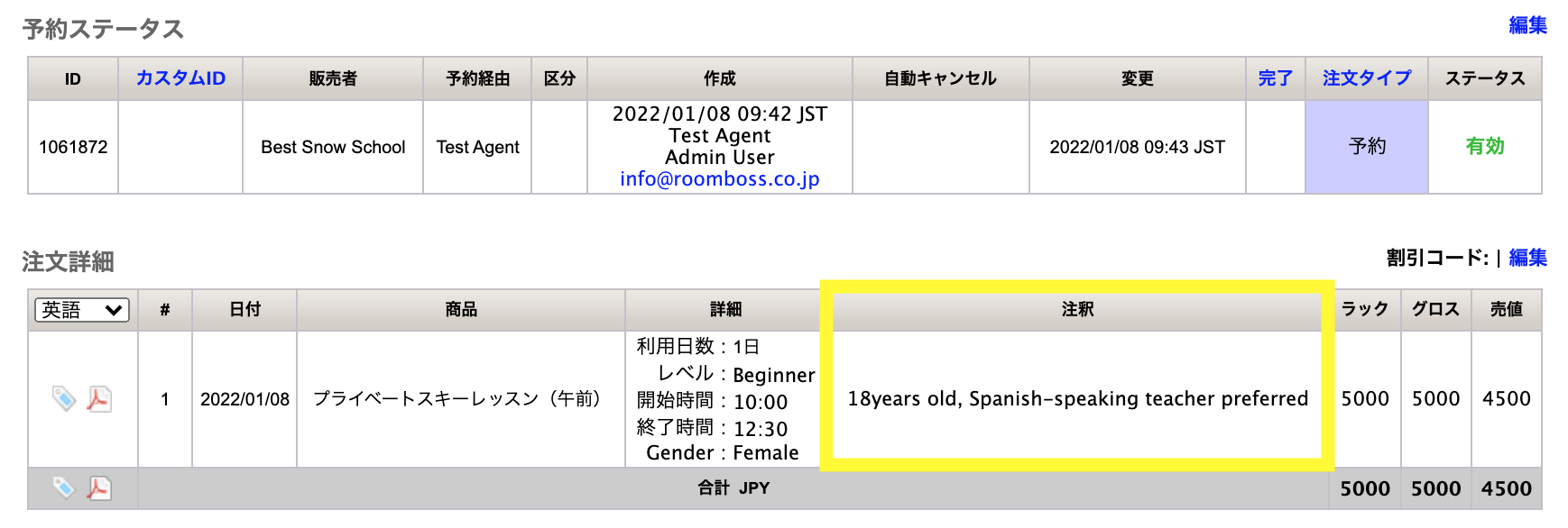 - 予約の編集ページ、注文詳細欄の編集ボタンをクリックし、注釈にコメントを追加します。