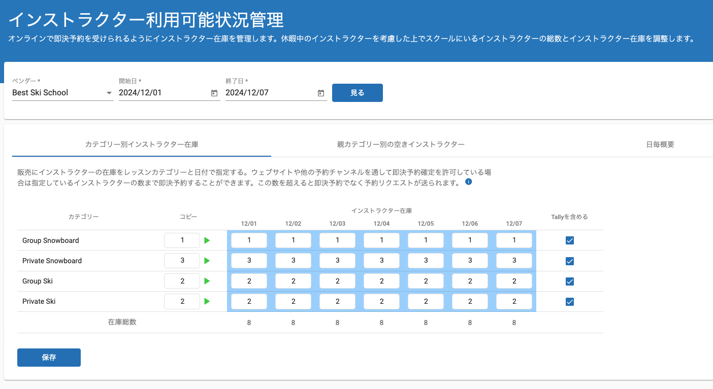 注意:カテゴリータイプ間で人数を変えたり動かしても大丈夫だが、在庫総数がその日働いているインストラクターの人数を上回らないようにします。