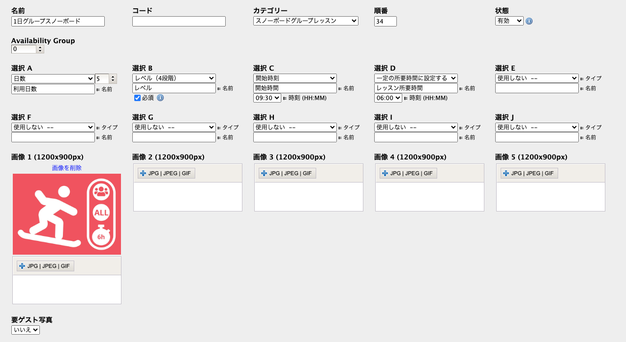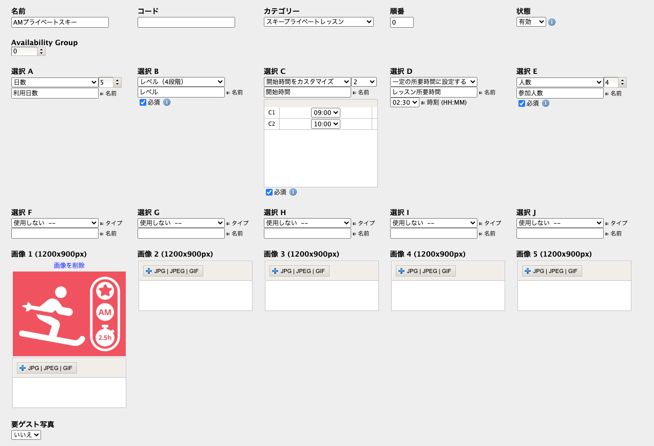 項目は全商品を通して同じ位置で固定することを推奨します。 例:開始時間は常に選択Cで固定。一部商品で、開始時間の項目が不要の場合は、選択Cで「使用しない」を使用。
